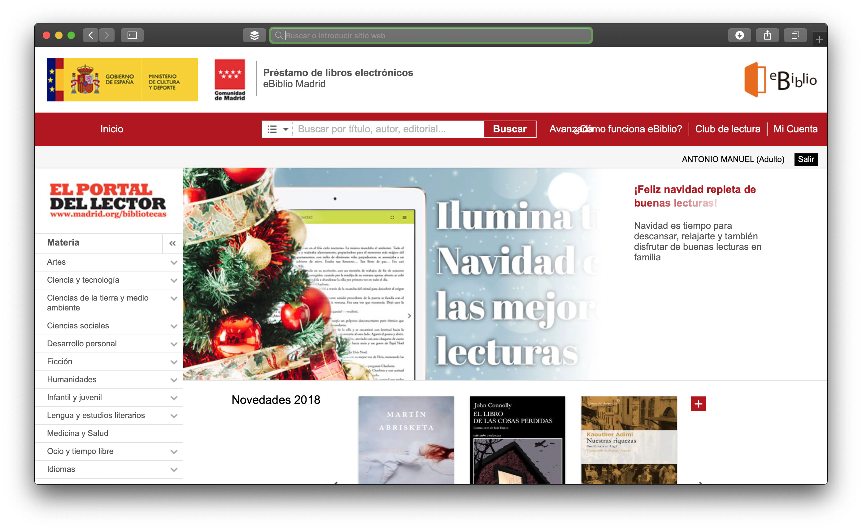 Para tomar prestado un libro, lo primero que hacemos es buscarlo. Tenéis un menú de categorías a la izquierda, un buscador en la parte superior y una portada con una serie de listas que, además, creo que son seleccionadas por personas humanas, lo cual está bastante bien.