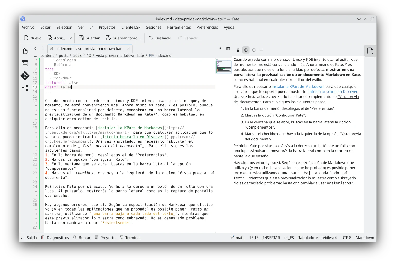 Cuando enredo con mi ordenador Linux y KDE intento usar el editor que, de momento, me está convenciendo más. Ahora mismo es Kate. Y es posible, aunque no es una funcionalidad por defecto, mostrar en una barra lateral la previsualización de un documento Markdown en Kate, como es habitual en cualquier otro editor del estilo.